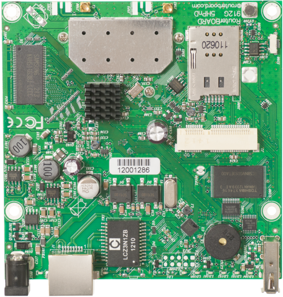 - RouterBOARD 912UAG with 600Mhz Atheros CPU, 64MB RAM, 1xGigabit LAN, USB, miniPCIe, built-in 5Ghz 802.11a/n 2x2 two chain wireless, 2xMMCX connectors, RouterOS L4 US Version