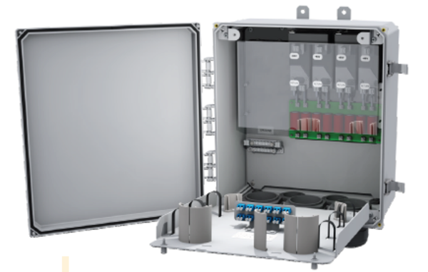 Configurable cable ports are designed to accommodate varying diameters of hybrid (combined power and fiber optic) or standard cables